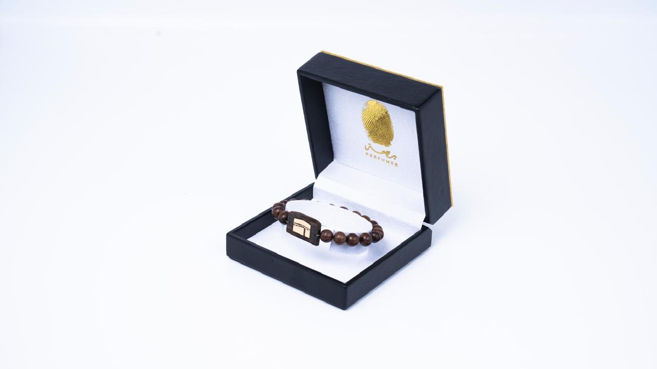 Combinaison de Matériaux Précieux : L’alliance de perles de bois d’oud véritable et de finitions dorées pour un contraste luxueux et naturel.